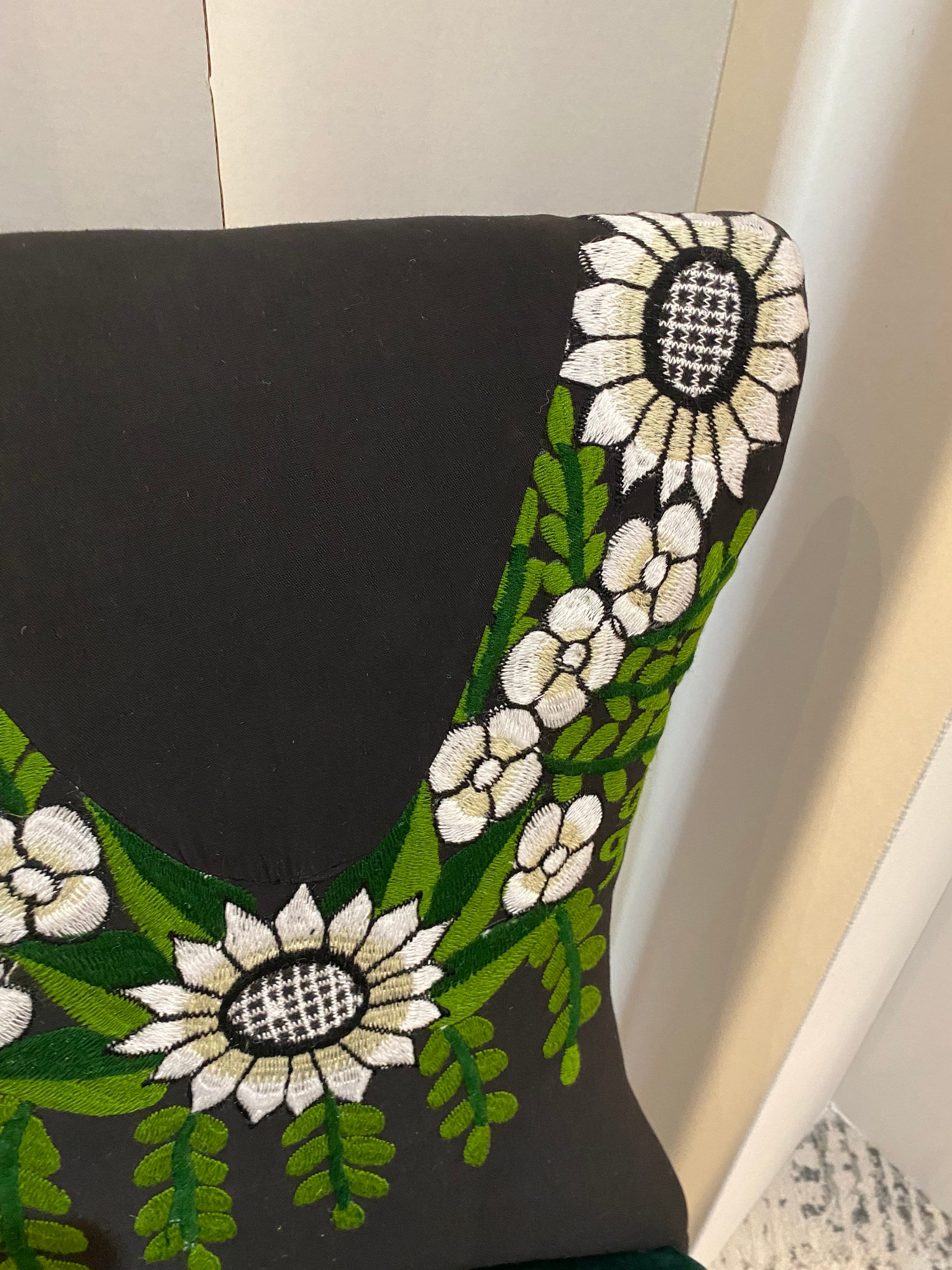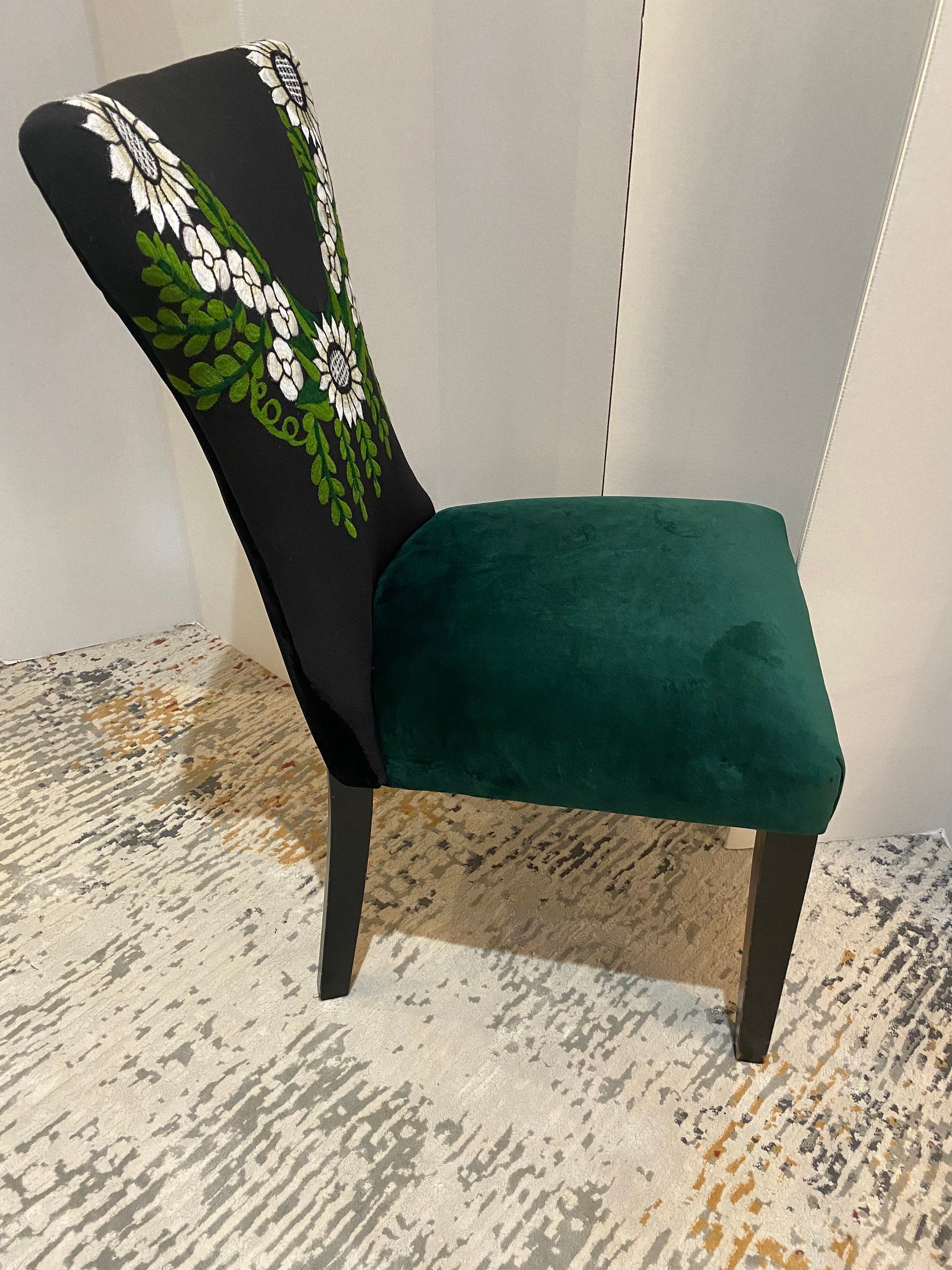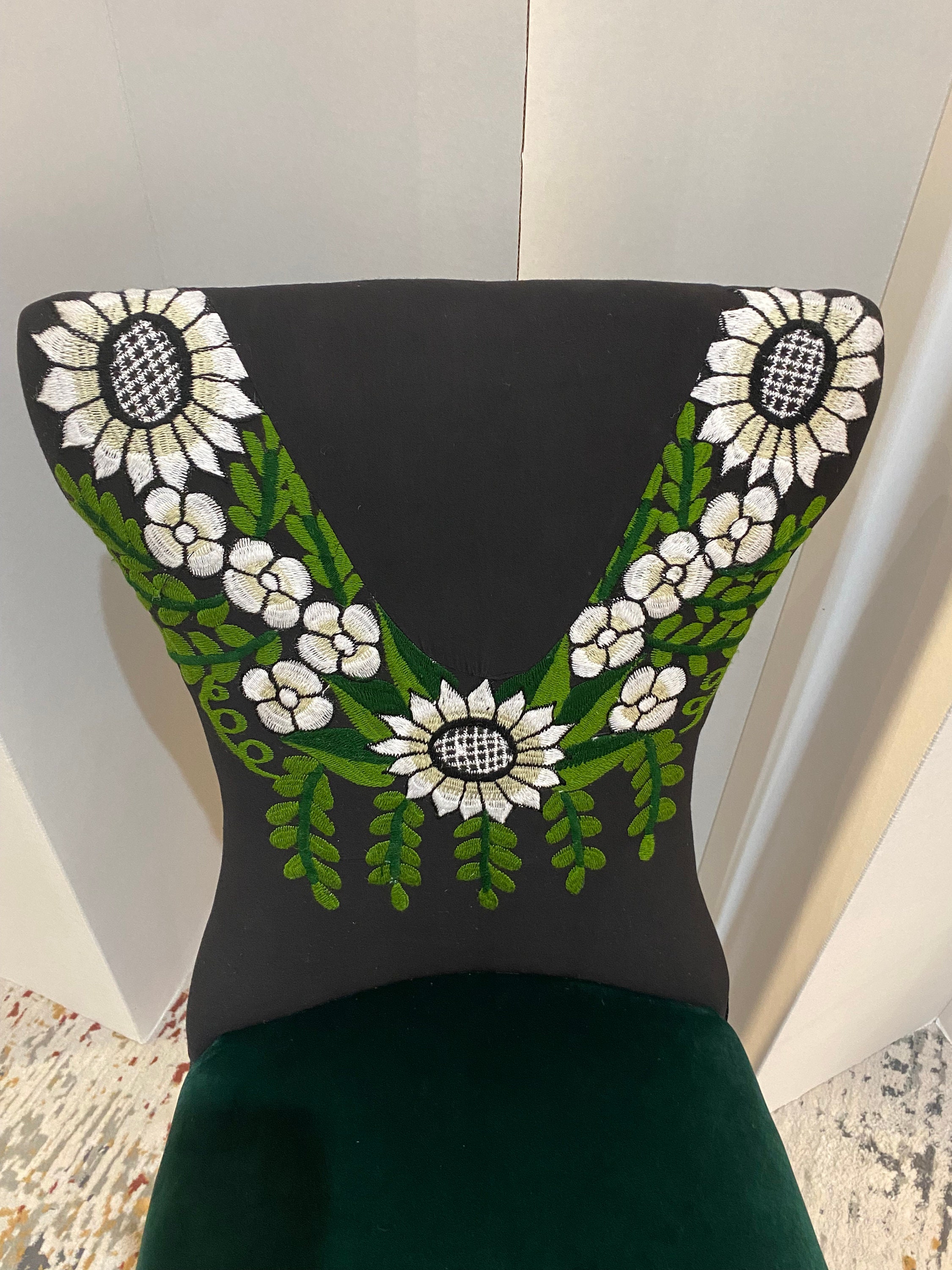 This is a comfortable accent chair with a trapezoid shape back. It has been re-upholstered with fine colorful hand-made embroidery. The back has soft black velvet, as well as the seat in hunter green velvet. The embroidery in black with white florals gives this chair a unique classy touch.