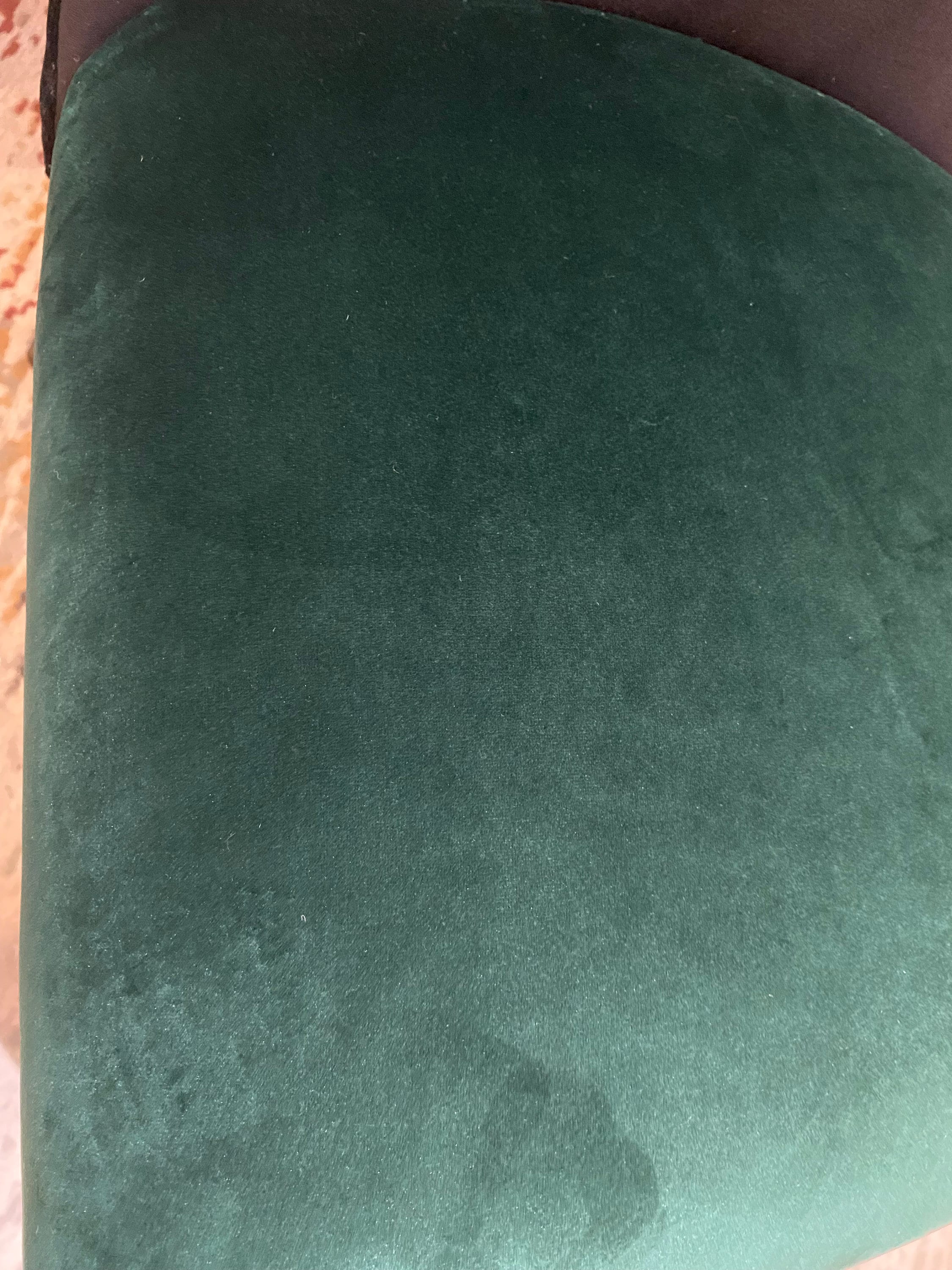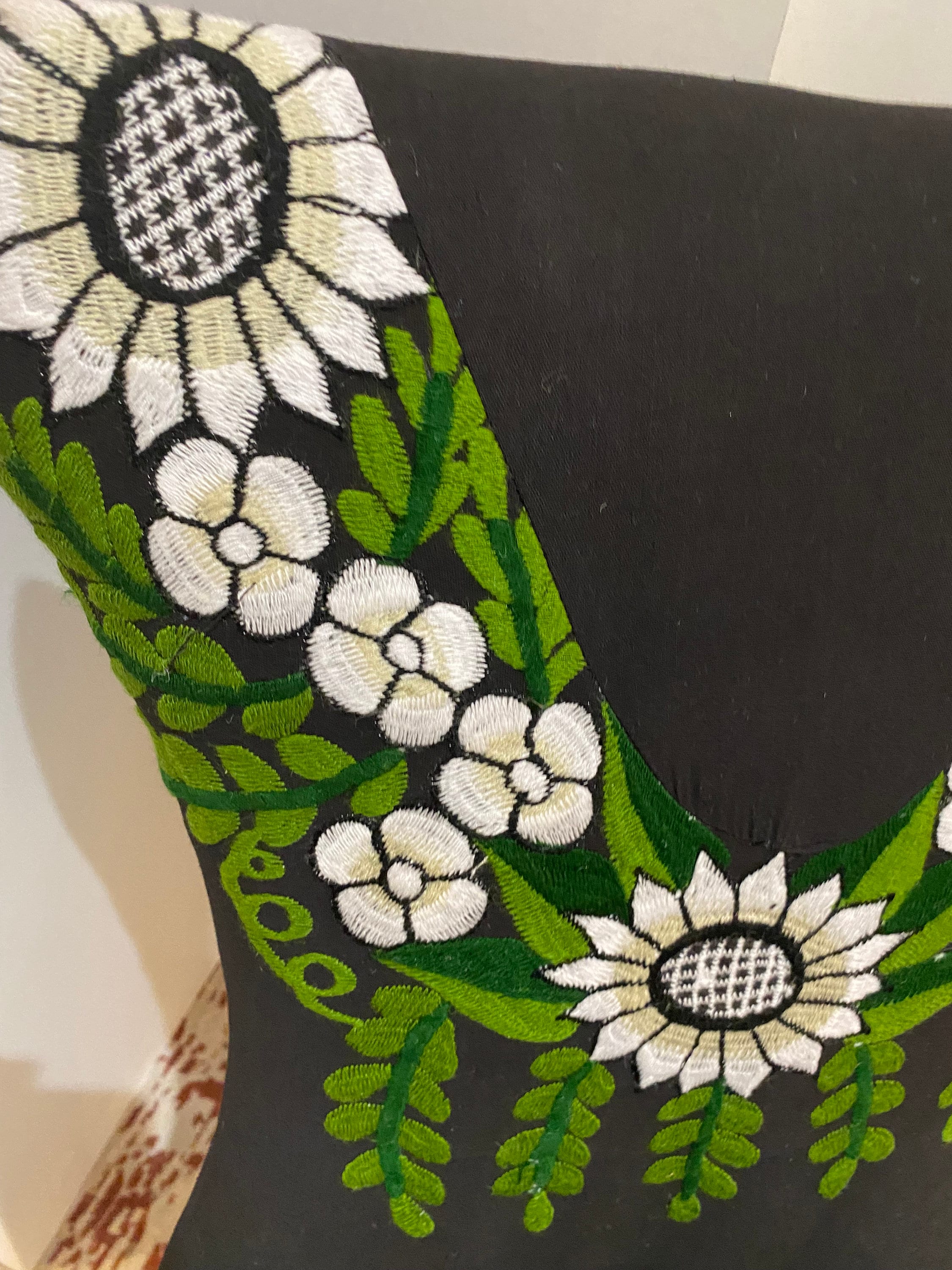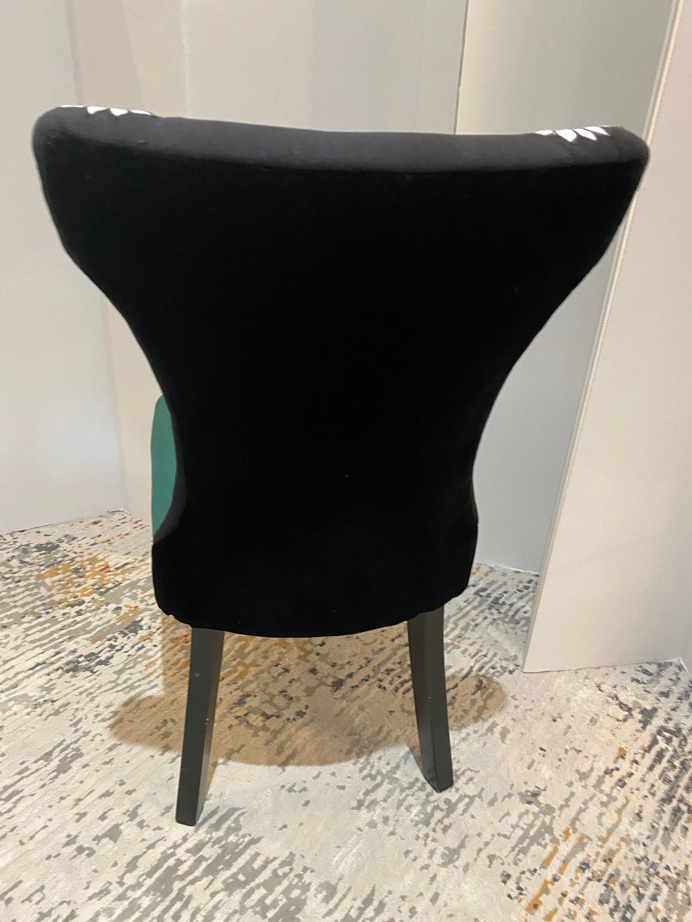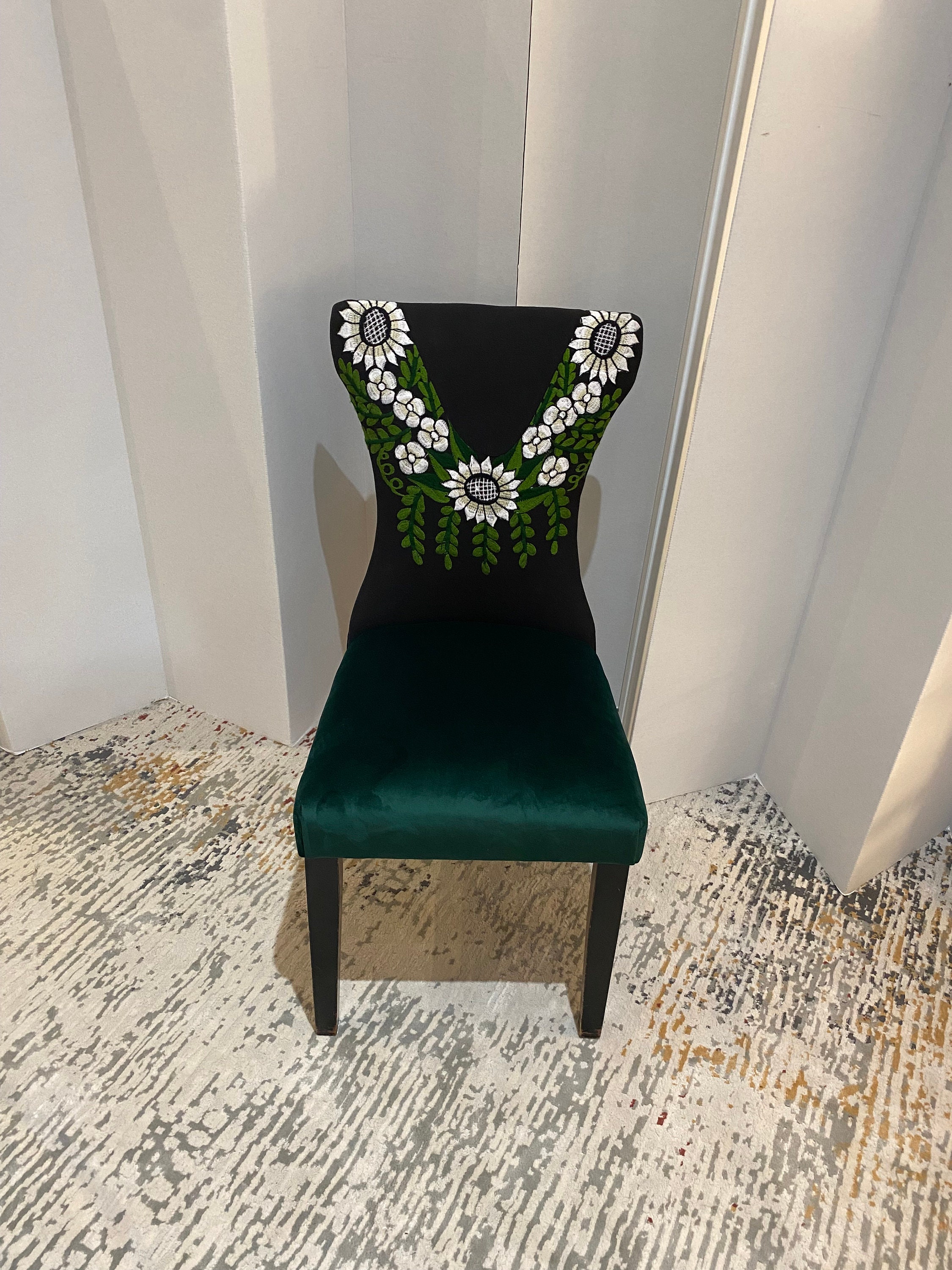 This is a comfortable accent chair with a trapezoid shape back. It has been re-upholstered with fine colorful hand-made embroidery. The back has soft black velvet, as well as the seat in hunter green velvet. The embroidery in black with white florals gives this chair a unique classy touch.
