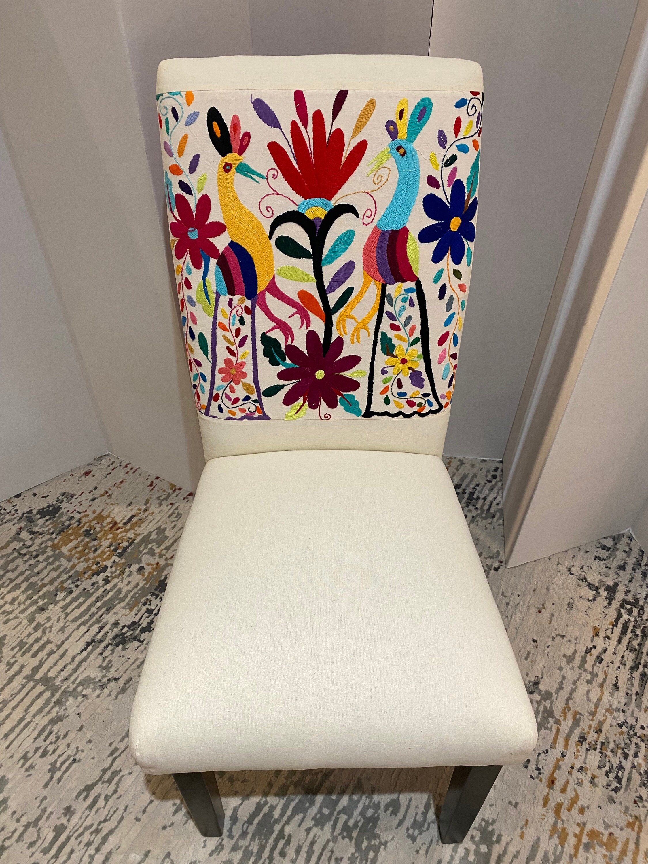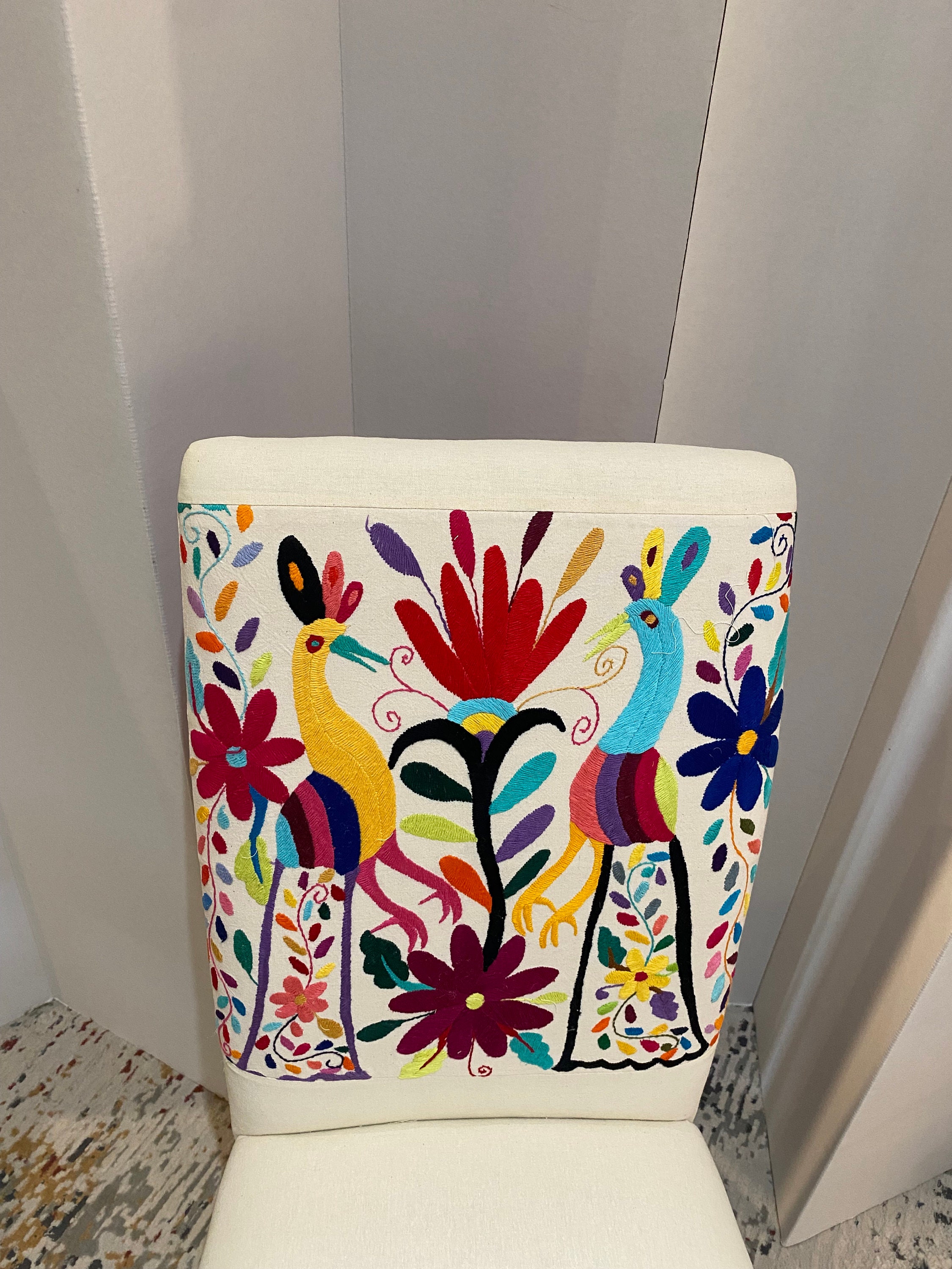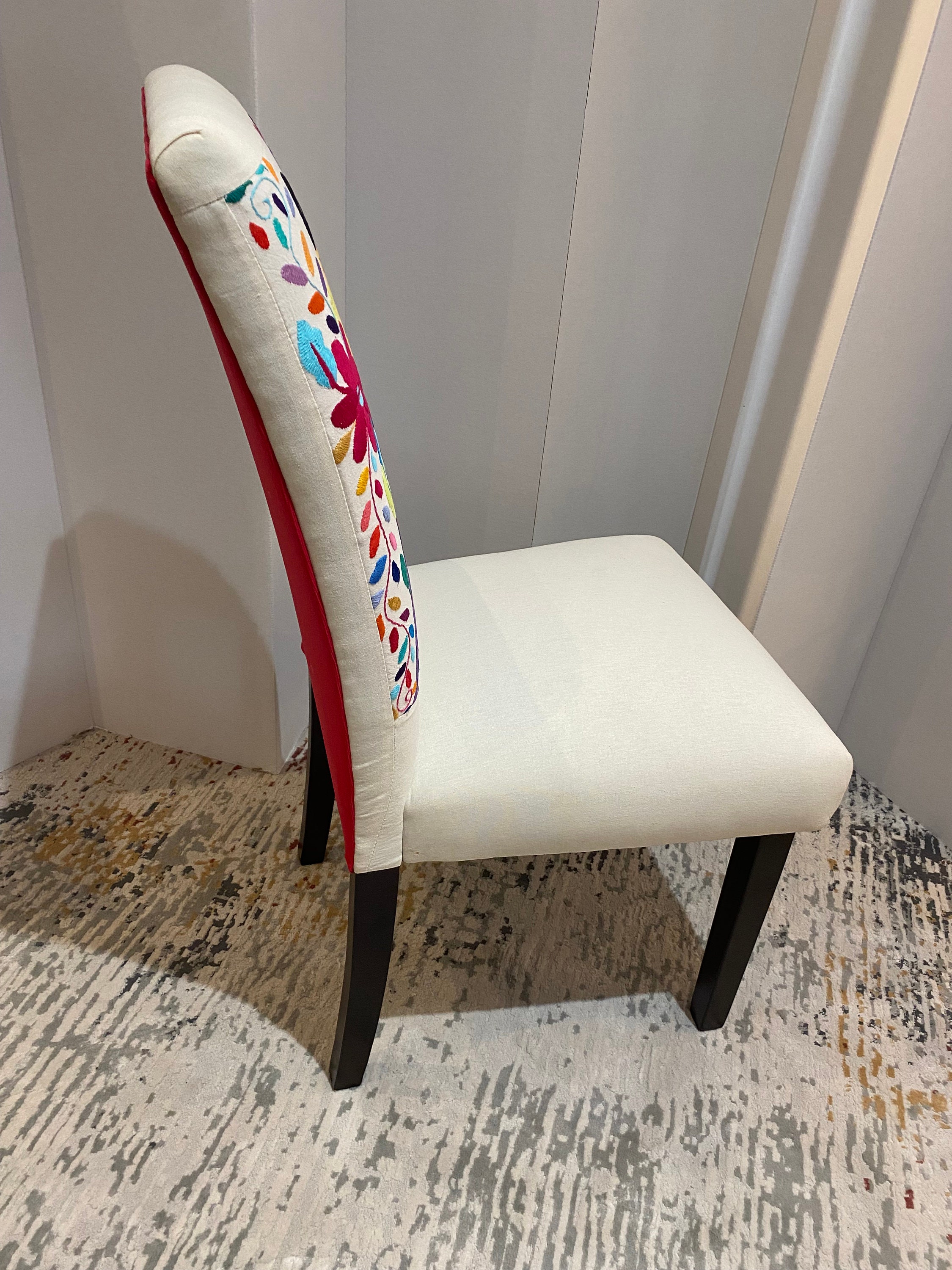 This Parson's style accent chair will match any color scheme because of its neutral light cream and colorful Tenango embroidery with florals and birds. The back on bright red velvet makes this piece stand out in any corner.