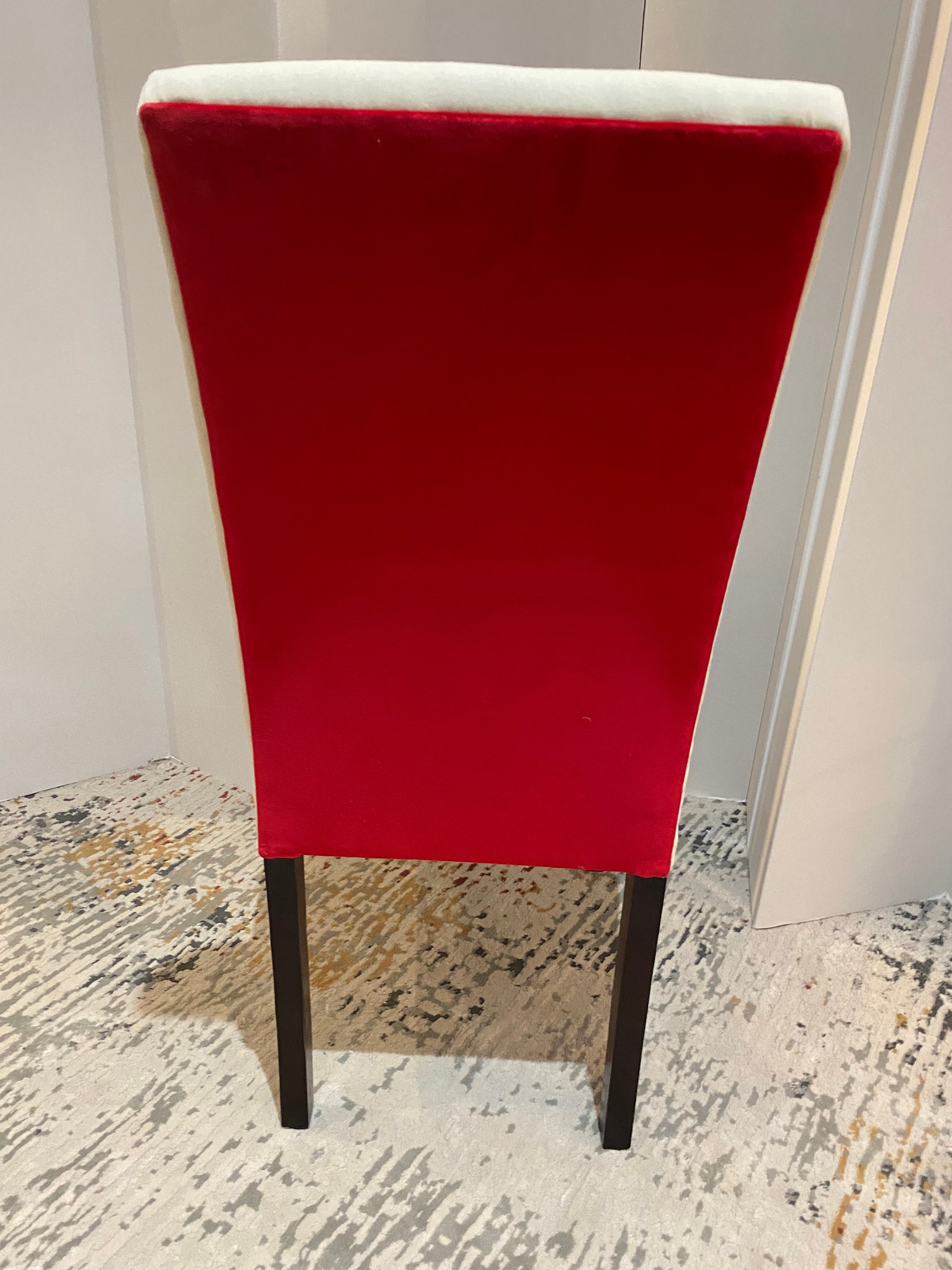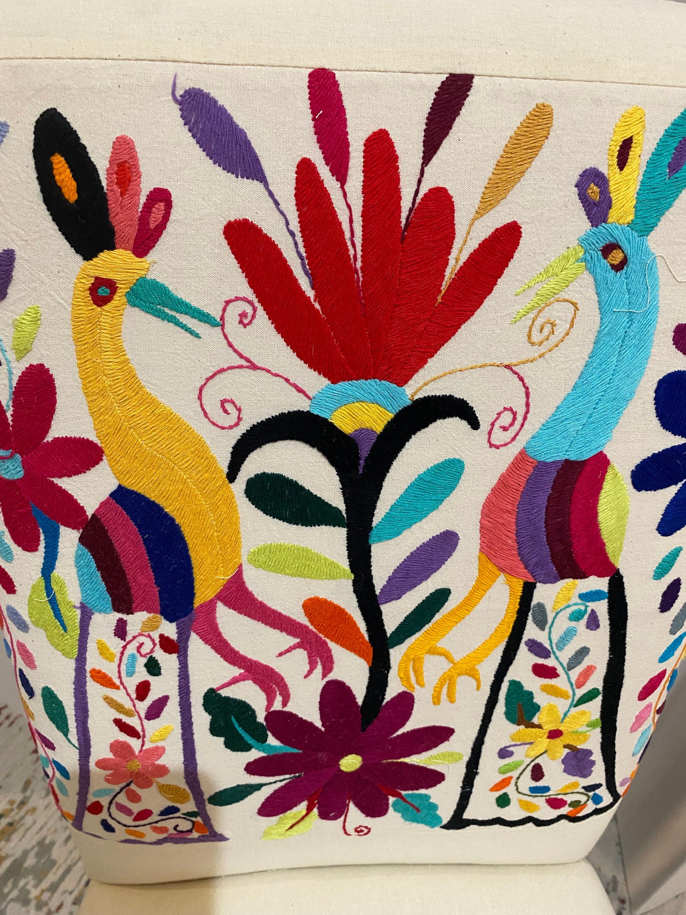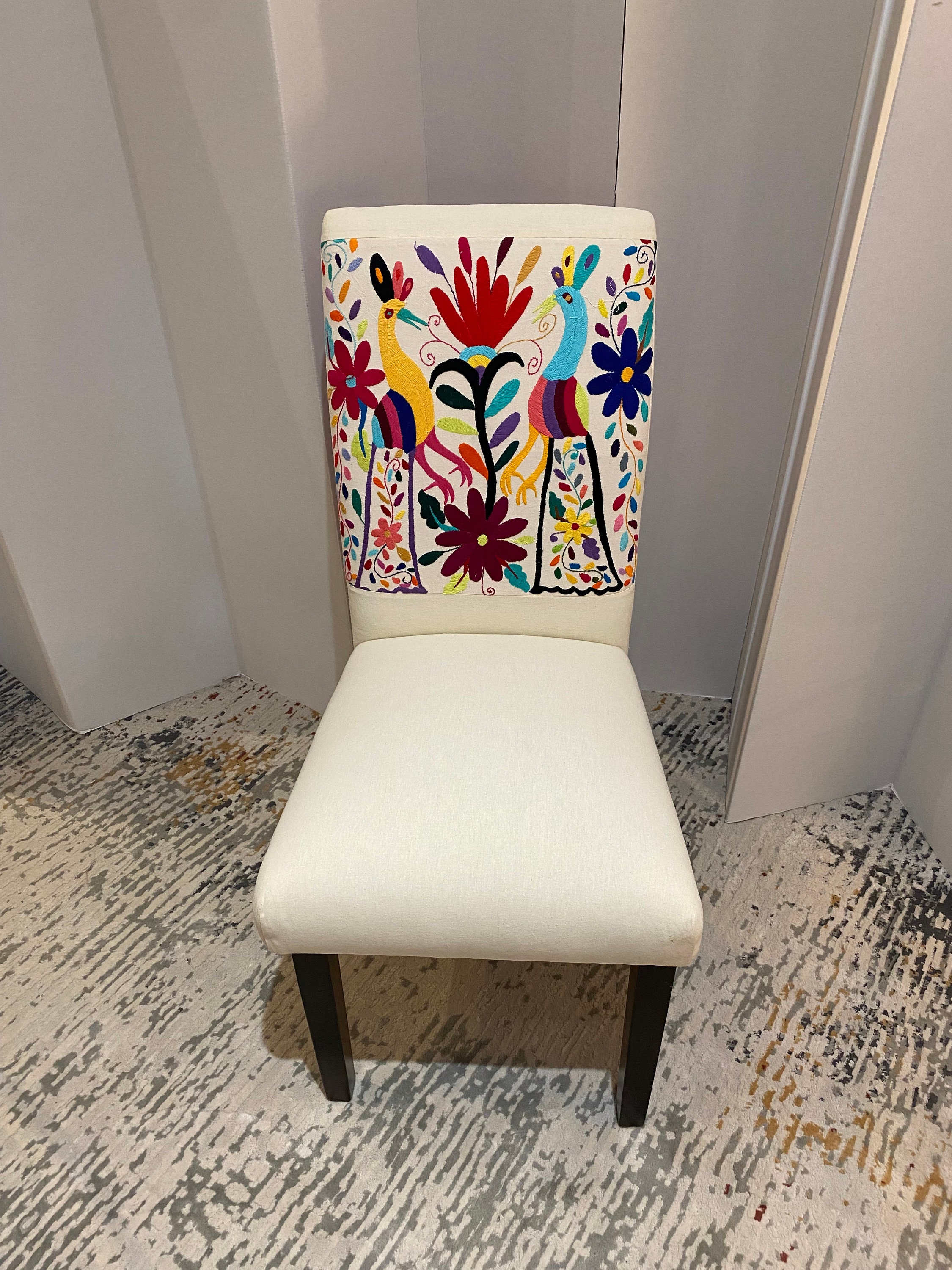 This Parson's style accent chair will match any color scheme because of its neutral light cream and colorful Tenango embroidery with florals and birds. The back on bright red velvet makes this piece stand out in any corner.